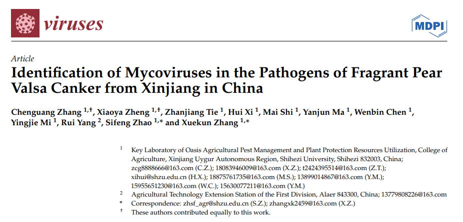 近日,304永利集团植物病害绿色防控研究团队赵思峰教授研究小组在绿色防控库尔勒香梨腐烂病中取得新进展,研究成果以“Identification of Mycoviruses in the Pathogens of Fragrant Pear Valsa Canker from Xinjiang in China”(中国新疆地区香梨腐烂病菌中真菌病毒的鉴定)为主题,发表在病毒学领域期刊《viruses》(中科院二区,IF=4.7)。