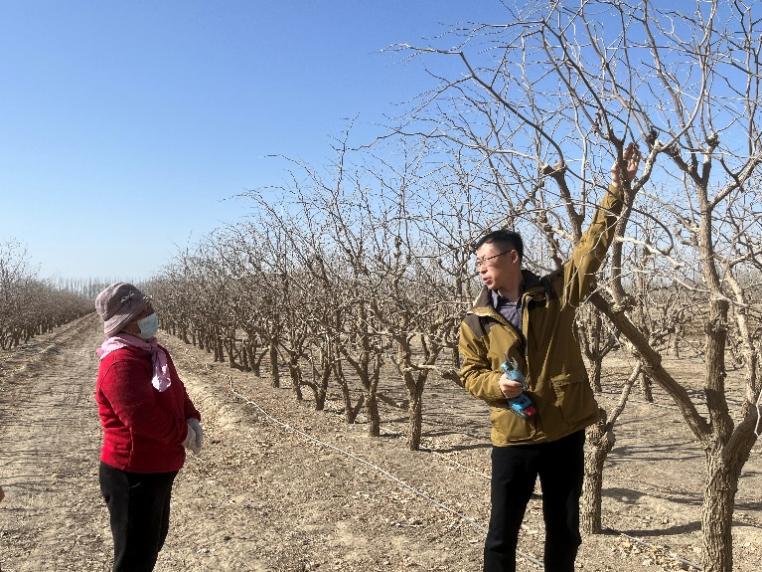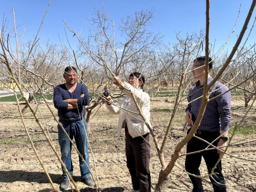 团队还赴各连队“连村共建”结对村开展科技帮扶。在石榴新村,团队详细查看了多种防寒措施下石榴越冬效果,为更高效进行石榴埋土防寒提供指导;针对石榴园不完全花比例较高的问题,团队制定了有机肥/化肥配施与春季修剪结合的综合管理措施。在羌古村和巴丘克村,团队对桃树春季修剪及石硫合剂施用的重要性进行了详细讲解,并现场示范桃树春季修剪。农户艾拜杜拉表示“专家的指导使我充分认识到桃园春季管理的重要性,相信通过合理的春季管理,可以避免往年桃树食心虫爆发以及桃树挂果部位越来越高的问题”。
