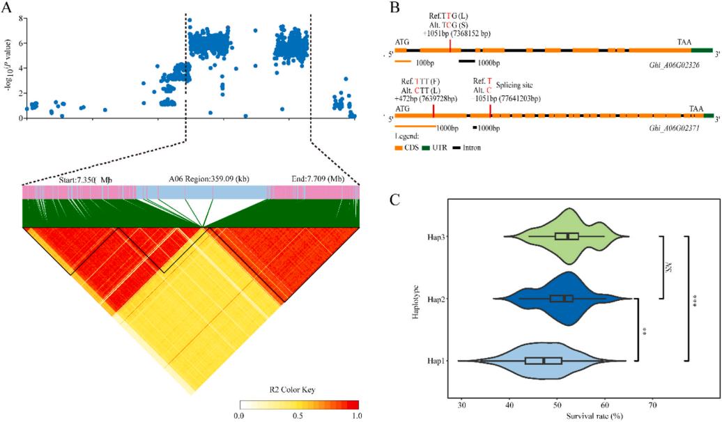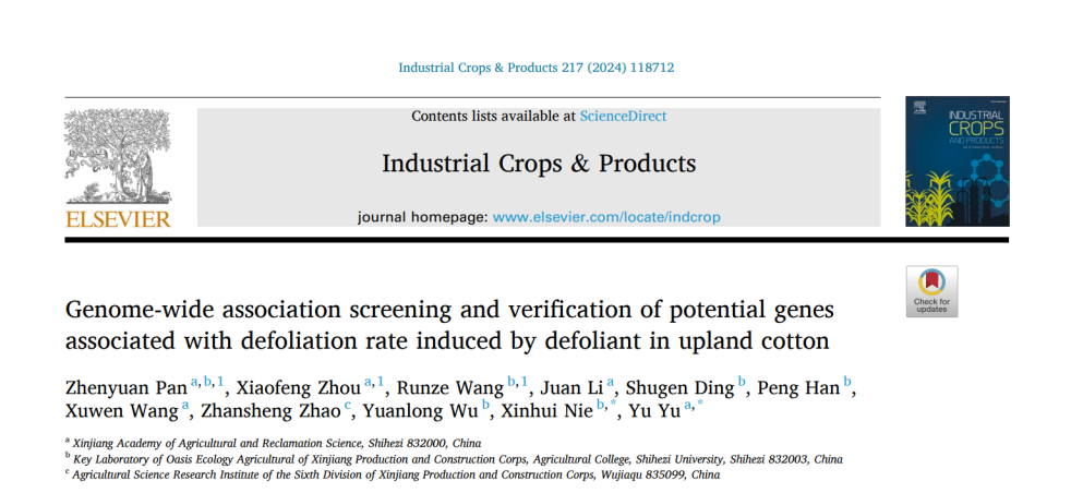 近日,304永利集团官网联合新疆农垦科公司在中科院一区TOP 期刊Industrial Crops & Products发表了题为 “Genome-wide association screening and verification of potential genes associated with defoliation rate induced by defoliant in upland cotton”的研究论文。该研究通过利用328份陆地棉种质脱叶剂处理后的脱叶率进行全基因组关联分析,挖掘到了一个控制脱叶剂敏感性主效QTL,并鉴定到一个关键基因,驯化分析结果表明,该基因优异单倍型在中国机采棉育种过程中受到了选择。