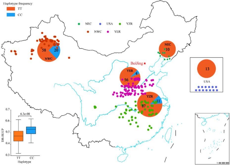 该研究对328分脱叶剂处理的陆地棉品种4个环境的脱叶率(DR)进行全基因组关联分析,在多环境及BLUP中鉴定到一个控制脱叶剂敏感性主效QTL qDS-A06 (图1)。结合连锁不平衡分析、单倍型分析和表达分析,在qDS-A06中鉴定出一个影响DR的关键候选基因,命名为GhDS-A06,该基因编码一个TPR蛋白,西红柿和拟南芥同源基因参与了离层的发育。GhDS-A06的单倍型分析发现,基因型为GhDS-A06CC的植株比基因型GhDS-A06TT的植株对脱叶剂更敏感,因此将GhDS-A06TT认为是优异的单倍型(图2)。进一步分析发现,优异单倍型频率在我国不同棉花产区间存在差异,来源于西北地区(主要是新疆)陆地棉品种的优异单倍型频率远高于其他地区(图3),这和我国的机采棉起源地也是相吻合的,表明该单倍型在我国机采棉育种过程中得到了选择和固定;尽管如此,在西北地区,仍然有25%左右的陆地棉品种不包含优异等位基因,因此,还有进一步开发利用的潜力。进一步通过对GhDS-A06在脱叶剂敏感和不敏感两种材料中诱导表达分析发现GhDS-A06负调控陆地棉叶柄脱离层的形成,该功能和西红柿同源基因功能一致。综上,本研究结果不仅为陆地棉落叶敏感性的遗传研究奠定了基础,也为机采棉脱叶剂敏感性的遗传改良提供了理想的靶点。