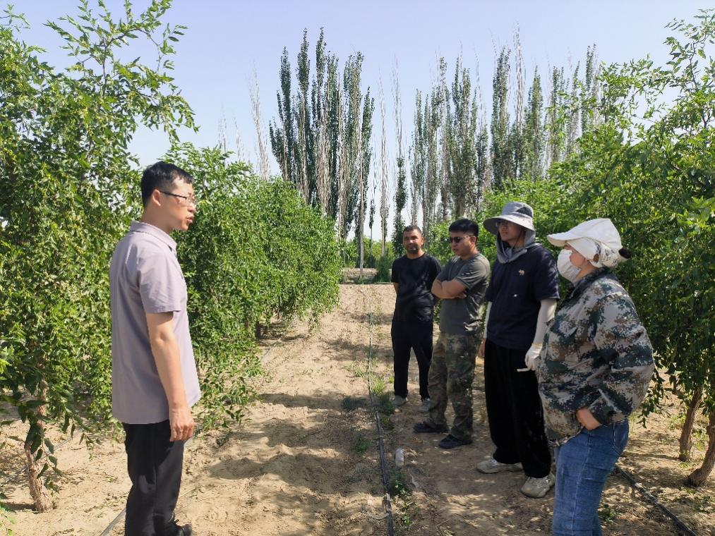 当前正值红枣保花保果的关键时期。在第十四师各团场红枣提质增效示范园,团队一行对当前天气以及红枣开花和坐果情况进行调研,就当前抹芽、摘心、疏枝以及保花保果等管理技术进行了实地指导。另外,针对枣树不同栽培模式树形的培养提供详细指导方案,并实地查看了皮山农场红枣嫁接成活情况,对下一步管理进行指导。另外,团队还对“科技兴村”工程各连队结对村开展桃、苹果、石榴栽培技术指导。