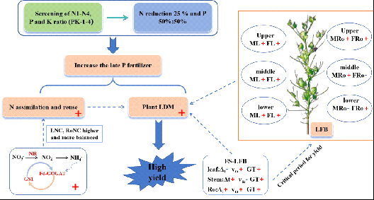 该研究以中棉所109为试验材料,在减氮(299 kg hm-2)下设置4个磷肥比例,以传统施氮水平(402.5 kg hm-2)为对照。研究发现,在减氮条件下,50%:50%(蕾期:花铃期)的施磷比例可平衡减产效应,实现减氮不减产的目标,主要归因于其处理可以提高棉花中上层叶片和生殖器官的氮含量和干物质积累(尤其是果枝叶),进而增加单铃重和单株铃数。此外,氮含量和干物质的增加主要是通过增强生育后期棉株氮再利用能力,提高籽棉产量(6.7-24.5%)。本研究明确了精准调控水肥一体化施肥运筹管理模式可实现肥料高效、作物高产的绿色可持续生产目标。