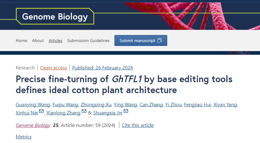 在华中农业大学棉花遗传改良团队联合攻关指导下,两个团队通过优化腺嘌呤脱氨酶,在棉花中建立了高效的腺嘌呤碱基编辑器GhABE8e,并利用GhABE8e对GhTFL1进行高密度的碱基突变,从而获得大量中间表型的突变体材料,并从中发掘出控制棉花理想株型的新遗传位点,创制出株高适中、果枝缩短、株型紧凑以及生育期缩短的棉花新种质,实现GhTFL1基因的快速定向进化。该研究根据棉花机械化产业发展的重大需求,聚焦阻碍棉花株型育种的限制因素,从生物技术平台建设与株型育种两个方面入手,首先构建和优化适用于棉花高效的ABE碱基编辑系统,随后构建靶基因高密度文库,并围绕碱基编辑定向进化辅助筛选棉花理想株型开展了一系列的研究工作,为株型精准调控提供重要理论基础,以及为获得高产、高效、优质的机采棉提供重要育种基础材料。