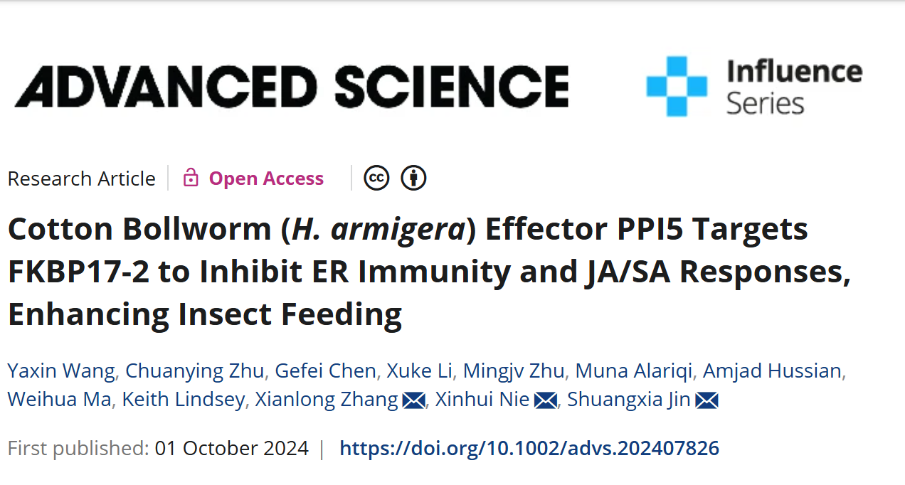近日,304永利集团官网聂新辉团队与华中农业大学棉花遗传改良团队合作在Advanced Science杂志在线发表了题为"Cotton bollworm (H. armigera) effector PPI5 targets FKBP17-2 to inhibit ER immunity and JA/SA responses, enhancing insect feeding"的研究论文,解析了棉铃虫效应子PPI5靶向FKBP17-2抑制内质网免疫和JA/SA响应,促进昆虫取食的分子机制。研究结果为棉铃虫效应子PPI5如何介导防御反应在植物上定殖和生存提供了重要的机制见解。新的效应子的发现及其作用机制的阐明,对植物抗虫育种具有重要的指导意义。它可以为植物内源抗虫和昆虫生长发育提供关键基因,为棉花抗虫育种奠定良好的生物学基础,并为害虫防治策略提供新的研究思路。