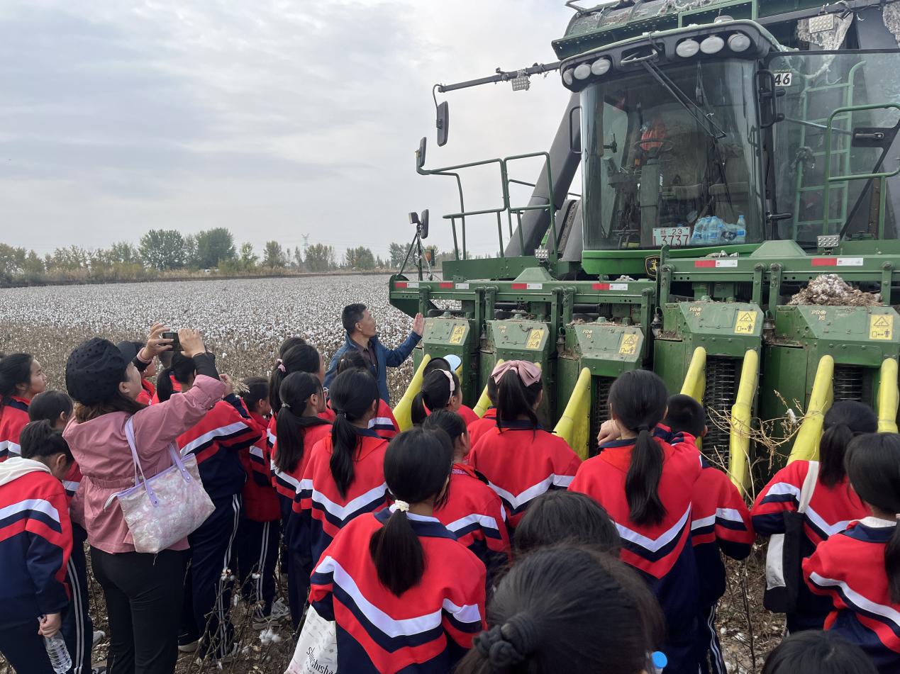 随后,小员工们观看了采棉机采摘棉花的壮观场景。随着采棉机的轰鸣声,一排排棉花植株被整齐地收割,棉絮如雪般被吸入机器内部。小员工们被这一现代化的农业设备深深吸引,纷纷发出惊叹声。他们了解到,采棉机的使用不仅大大提高了采摘效率,还减轻了农民的劳动强度。小员工们表示将来也要努力学习,为我国的农业现代化贡献力量。
