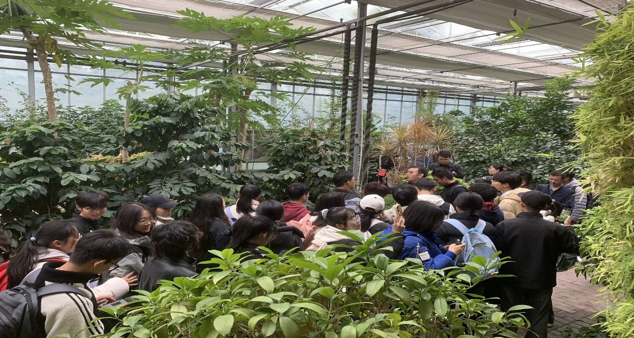 热带生物研学馆中异彩纷呈的热带植物吸引着同学们拍照驻足。潘旭东老师通过讲解热带植物的独特习性和生长环境,点出了土壤养分和空气水分等因素对植物生长的影响,引导同学们进一步思考作物、气候与土壤的关系。