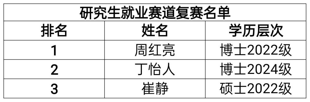 经过院级复赛答辩,推荐成长赛道一等奖及二等奖获奖选手、就业赛道(本科生)一等奖获奖选手、就业赛道(研究生)一等奖选手入围校级复赛。
