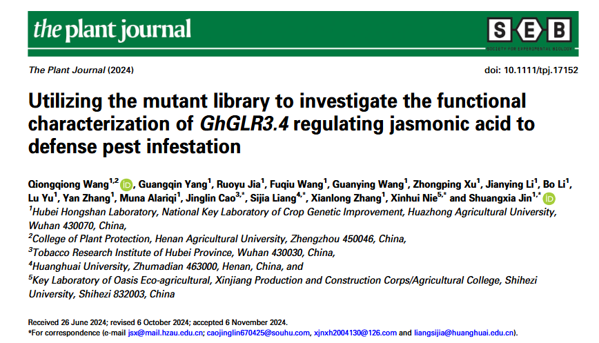 近日,304永利集团官网聂新辉教授团队与华中农业大学棉花遗传改良团队合作在The Plant Journal上发表了题为“Utilizing the mutant library to investigate the functional characterization of GhGLR3.4 regulating jasmonic acid to defense pest infestation”的研究文章。本研究利用 CRISPR/Cas9系统创建了GhGLRs突变体文库,共获得135个独立的转基因系。筛选出响应斜纹夜蛾和烟粉虱侵染的关键基因(GhGLR3.4基因)的三个(ghglr11-520a, ghglr11-311a和ghglr11-25g)独立的突变体。并利用非损伤微测技术揭示了GhGLR3.4基因参与了谷氨酸和斜纹夜蛾口水的刺激下的细胞内Ca2+浓度的瞬时变化规律,解析了GhGLR3.4影响茉莉酸途径的合成,并积极参与植物间的远距离信号传输,促进防御信号向邻近叶片的传递,从而触发系统防御的作用机制。