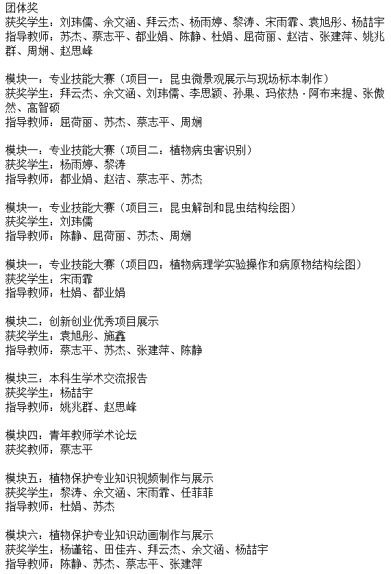 在本届大赛8个单项竞赛中全部获奖,并取得“植物病理学实验操作和病原物结构绘图”“昆虫微景观展示与现场标本制作”“植物病虫害知识竞答”三个单项一等奖等多个奖项,同时获得团体奖一等奖。