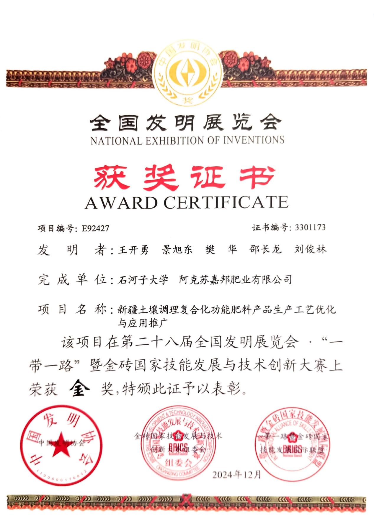 近日,第二十八届全国发明展览会“一带一路”暨金砖国家技能发展与技术创新大赛在广东省中山市小榄镇隆重举行。此次展览会有来自全国各地400多家创新企业和科研团队参赛,近千项发明创新成果项目进行了现场展示。304永利集团王开勇教授团队以“新疆土壤调理复合化功能肥料产品生产工艺优化与应用推广”项目荣获第二十八届全国发明展览会金奖。