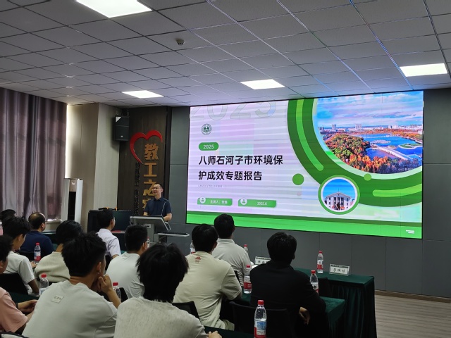 随后,第八师师市生态环境局贺磊主任作《八师石河子市环境保护成效专题报告》,系统梳理了石河子市生态环境治理成果与绿色发展路径,重点介绍了空气质量改善、重点水域水质提升及产业绿色转型等成效,深刻阐述了环保的时代重要性,并强调了老员工的责任担当。其详实数据和生动案例为师生提供了宝贵本土实践教材,深化了对“美丽石城”建设成果与方向的认识,现场反响热烈。