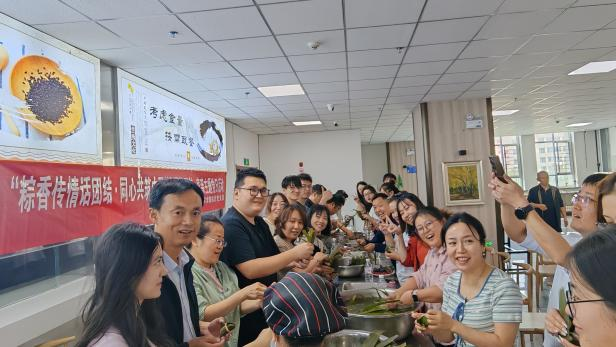 在最具特色包粽子环节,在老师的带领下,师生们围坐在一起,捋粽叶、填糯米、封口、扎捆,一片片清香的粽叶、一粒粒晶莹的糯米,在巧手下转眼变成一个个有棱有角的粽子,现场欢声笑语、其乐融融。巧手翻飞间,碧绿的粽叶包裹起雪白的糯米,传递着浓浓的节日温情。