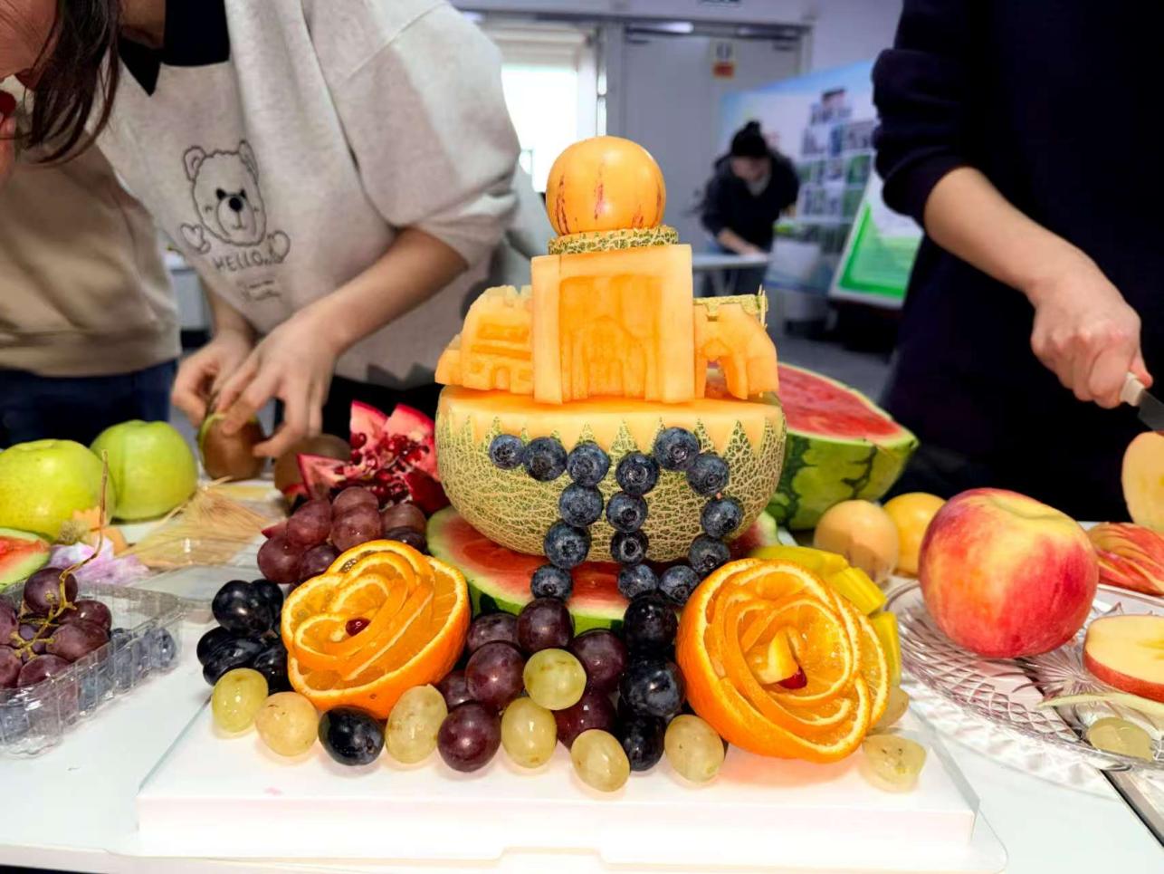 在果树知识讲解环节,各参赛团队利用多媒体课件,系统讲解所选树种的品种起源、生物学特性、栽培管理技术等内容,并结合社会实践分析产业难点,提出了建议方案。现场评委对各组汇报内容进行了打分和点评,对存在的问题进行了指导和说明。在创意果品拼盘展示环节,入围决赛的15支团队围绕祖国繁荣昌盛、民族团结进步、新疆各项事业蓬勃发展、青年奋发有为等主题,创作出《玉果耀华》《盛世果疆》《屯垦新篇,绿洲礼赞》《丝路华章·疆果同心》等15件作品。专家评审团从专业度、创意性、表现力等维度进行现场打分。